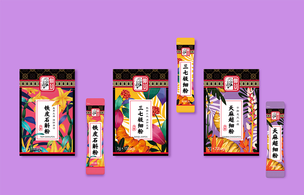 原有的口服粉包裝規格尺寸混亂,統一性弱,為使規范后的包裝更加統一,李華清項目團隊將包裝高度尺寸進行了統一規范,更好的突顯產品在終端陳列時的家族氣質。